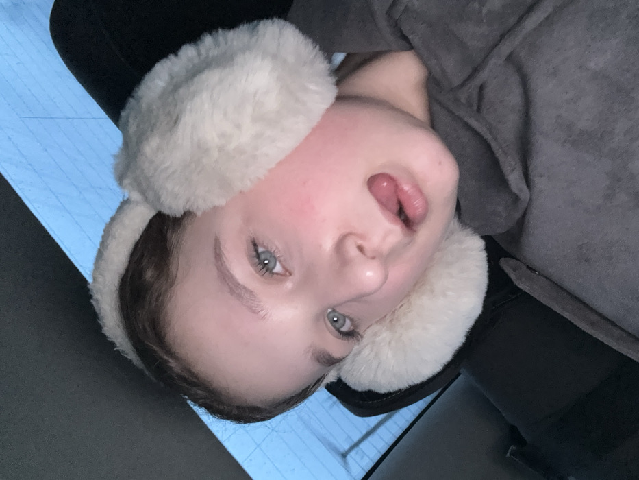 A close-up image depicts a young individual with light skin, blue eyes, and light brown hair, angled slightly to the left and looking towards the camera. The individual is wearing cream-colored, fluffy earmuffs and a dark gray hooded garment. Their tongue is partially extended from their mouth. The background on the left consists of dark, undefined shapes consistent with an interior space, possibly a vehicle seat or headrest. To the right and top, a muted light blue-grey area with a horizontal textured pattern is visible through what appears to be a window. The specific location in the city of Makiivka, Ukraine, cannot be determined from the visual information provided in the image.