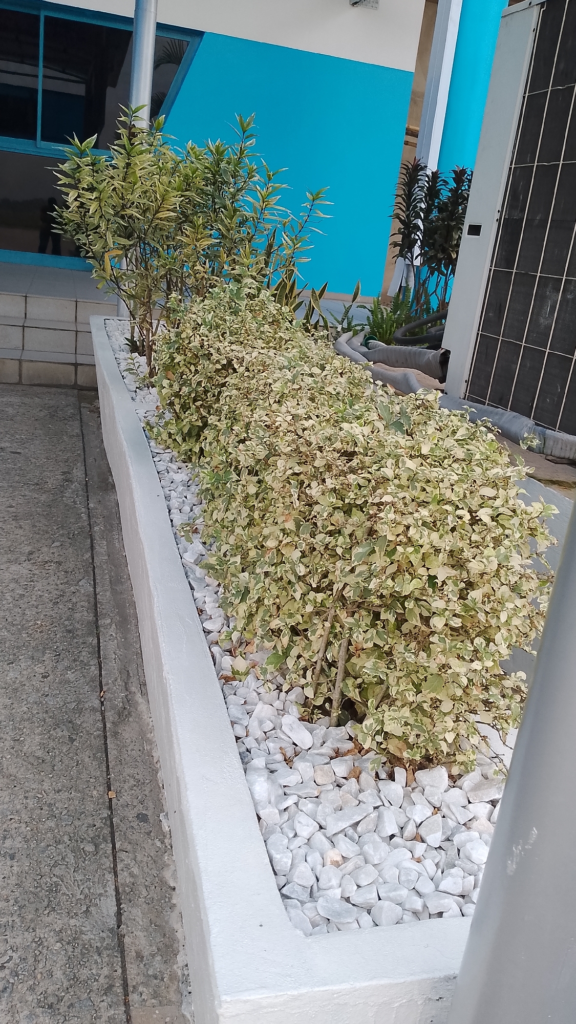 The scene depicts a well-maintained outdoor area in Orerokpe, Nigeria. In the foreground, a gray concrete walkway with a visible seam runs parallel to a low, white-painted concrete planter wall. The planter bed, located immediately behind the wall, is filled with white, angular decorative gravel. Emerging from this gravel are several plants. The dominant flora consists of numerous low-lying, bushy shrubs with variegated leaves, displaying a mix of light green, yellowish-green, and cream colors. Behind these shorter plants, a taller, slender shrub with solid green leaves extends upwards. In the midground and background, architectural elements are visible. A section of a building wall, painted a distinctive bright blue, forms a prominent backdrop. A horizontal window with a dark frame is partially visible on the left side of the blue wall. To the right, part of a technical unit, possibly an HVAC condenser or solar panel, with black fin-like structures and a light gray casing, is positioned vertically. Below this unit, coiled gray flexible tubing or conduits are visible, resting on a surface that also features darker green foliage. No individuals or active interactions are present in the image. The environment appears clean and organized under natural daylight.
