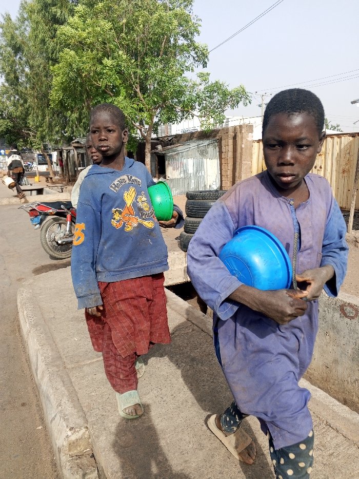 The image captures two young males walking on a concrete sidewalk in the city of Gombe, Nigeria, under bright daylight