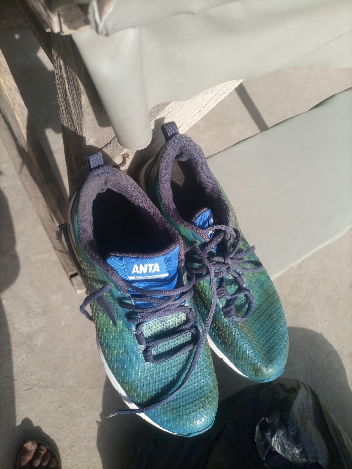 A pair of ANTA brand athletic shoes rests on a concrete surface in Jalingo, Nigeria