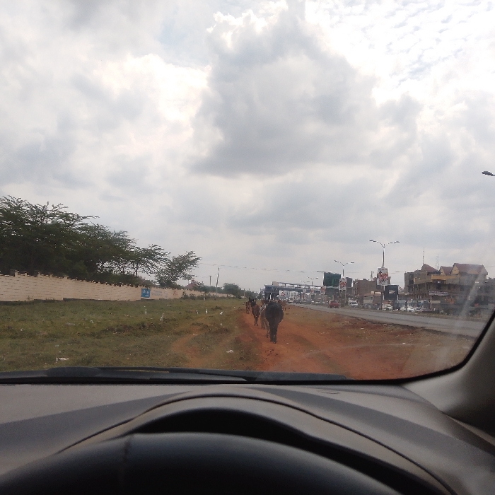 The image, taken from inside a vehicle looking forward through the windshield, depicts a semi-urban landscape in Nairobi, Kenya, likely along the Thika Superhighway
