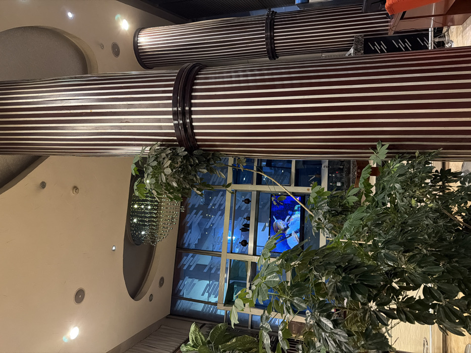 The image displays an upscale indoor environment, identified as a lounge or lobby area within the Hyatt Regency Addis Ababa, Ethiopia. Two prominent, fluted cylindrical columns, characterized by vertical dark brown and white stripes, are positioned in the foreground and midground. The ceiling above features recessed lighting and a large, multi-tiered chandelier adorned with numerous cascading, reflective elements. Lush green potted plants with broad leaves are strategically placed in the foreground and midground. In the background, a large expanse of blue-tinted glass panels demarcates a bar or service area, where a flat-screen television displays a brightly lit musical performance featuring an individual with a microphone. Above the television, a shelf behind the glass holds several dark, decorative ceramic vessels. A partial view of a counter or desk with an orange chair is visible on the far right. No individuals are present within the frame.