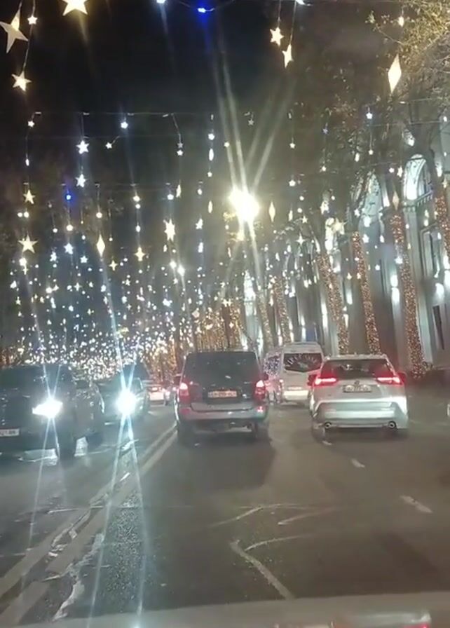 The video depicts a nighttime street scene with moderate traffic. The view is from inside a vehicle, presumably the driver's perspective. The road is wet, likely from recent rain. Overhead, numerous star-shaped lights are strung across the street, creating a festive atmosphere. Buildings line both sides of the street, their facades illuminated with decorative lights. Several cars are visible, including a dark SUV, a white van, and a silver sedan. The cars are moving slowly in the same direction, indicating a moderate level of congestion. The scene is well-lit by streetlights and the lights on the buildings. The ambient audio includes speech, suggesting the presence of people within the vehicle.