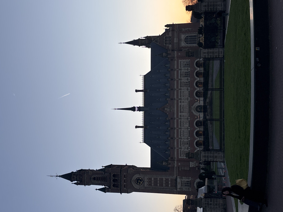 An exterior long shot depicts the Peace Palace (Vredespaleis) in The Hague, Netherlands, at dusk or dawn