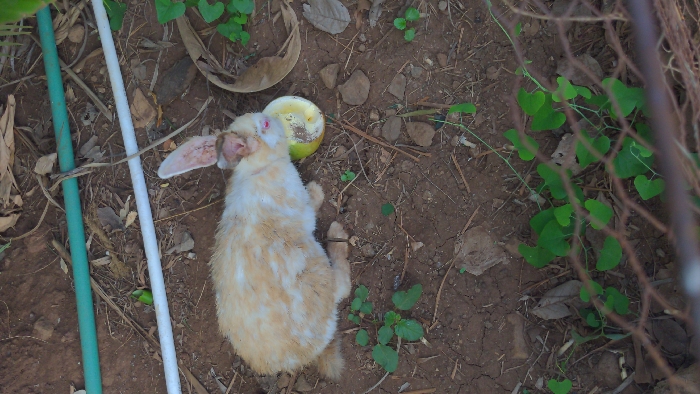 A rabbit with light brown and white fur lies on the ground near a partially eaten fruit