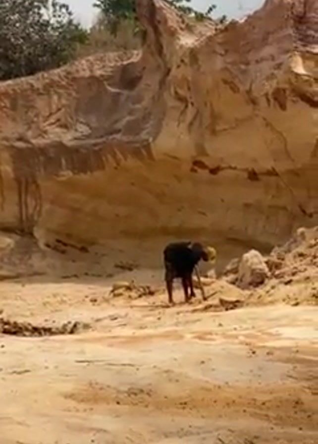 A man digs in a sandy pit using a pickaxe