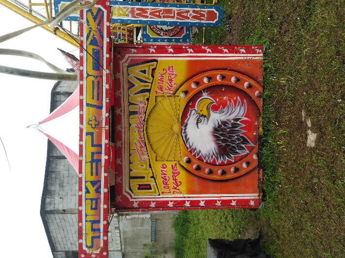 - "An outdoor, weathered ticket booth, painted predominantly red and yellow with orange and blue accents, stands on muddy, sparse green grass in Ciwalen, Indonesia" by FM-lcyaM2, licensed under CC BY 4.0