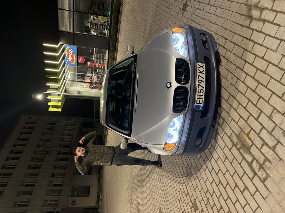 The image depicts a nighttime outdoor scene in Cherven Bryag, Bulgaria, featuring an adult male posing next to a silver BMW sedan. **Subjects:** 1. **Male Individual:** An adult male, appearing in his 20s or 30s, stands to the left of the car. He has short dark hair, a beard, and a mustache. He is wearing a dark olive green puffer jacket, dark grey sweatpants, and dark athletic shoes. He is striking a pose, flexing his biceps with both fists clenched and raised to shoulder height, while looking directly at the camera with a neutral expression. 2. **Vehicle:** A silver BMW 3-series sedan (E46 generation) is parked facing the camera, slightly angled towards the right. Its headlights are on, emitting bright white-blue light, with visible "angel eye" rings. The front bumper is a contrasting dark grey/blue color. A Bulgarian license plate, "BG EH 5797 KX", is affixed to the front bumper. The car's interior is dark and appears unoccupied. **Environment and Background:** 1. **Pavement:** The ground is paved with light-colored rectangular brick pavers arranged in a herringbone pattern. 2. **Retail Store:** To the right of the male and behind the car, a modern retail building with large glass windows is visible. The store has a prominent blue sign displaying "PEPCO" in white lettering and a red logo. The building's exterior is adorned with distinctive yellow and white vertical strip lighting that wraps around a corner. Merchandise, including clothing racks, is visible through the windows. 3. **Older Building:** To the left of the male and further back, an older, multi-story building with numerous windows is present. Its facade is a dull, light color, and it appears less illuminated compared to the foreground and the retail store. 4. **Lighting:** The scene is illuminated by artificial light sources including a streetlamp above the Pepco store, the car's headlights, and the retail store's exterior and interior lighting, indicating a nighttime setting. The sky is dark.