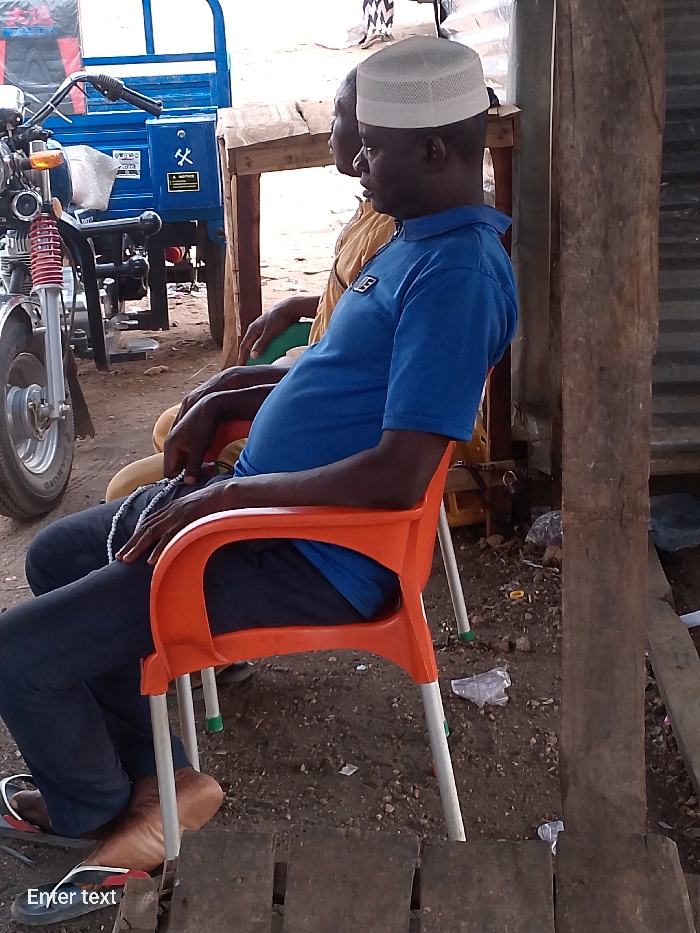 The scene depicts two adult males seated outdoors in the city of Unknown, Unknown. In the foreground, a dark-skinned male with a full physique is seated on an orange plastic chair with silver-colored metal legs. He wears a white, mesh-patterned kufi cap, a blue short-sleeved polo shirt, and dark trousers, with black and red flip-flops on his feet. His hands rest on his lap, holding a string of white prayer beads. He is looking towards the right of the frame. Behind him and to his left, a second dark-skinned male is partially visible, wearing a light-colored garment and seated on a green plastic chair. The immediate environment is unpaved, consisting of dirt and small stones, with scattered litter including plastic bags and bottle caps. To the left, a blue three-wheeled motorized rickshaw with a cargo bed is parked, displaying Chinese characters "父" on its side. Adjacent to the rickshaw, the front wheel, fork, and handlebars of a silver motorcycle are visible. In the background, a rough wooden table or stand is present behind the seated men, and a vertical wooden post forms part of a structure on the right side of the frame, alongside a corrugated metal sheet. The lighting suggests daylight conditions.
