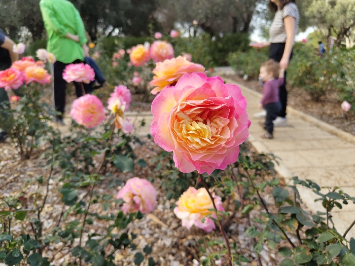 The image captures a rose garden in Zikhron Yaakov, Israel. In the immediate foreground, a multi-petaled rose, sharply in focus, displays a vibrant pink hue on its outer petals transitioning to a yellow-orange core. Numerous other roses, primarily pink and yellow-orange, are visible in soft focus throughout the scene, interspersed among green foliage. The ground cover consists of light-colored gravel or mulch. A paved pathway, composed of light-toned rectangular tiles, runs diagonally from the bottom right into the background. On the left side of the midground, an individual wearing a bright green top and dark pants is partially visible from the waist up, facing away from the camera, amidst rose bushes. On the right, a woman in a striped shirt and dark pants stands on the pathway, holding the hand of a small child. The child, wearing a purple top and dark pants, is walking on the path, appearing to use a pacifier. All individuals are in soft focus. The background features blurred trees with dark trunks and sparse foliage, indicating an outdoor, cultivated garden setting.