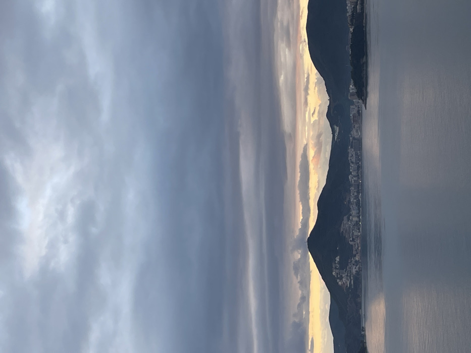 A landscape photo shows a mountain range with a city nestled along its base, bordering a calm body of water. The sky is filled with layered clouds, predominantly gray and blue, with streaks of yellow and orange appearing near the horizon where the sun seems to be setting. The light reflects on the water's surface, creating a serene and muted atmosphere.