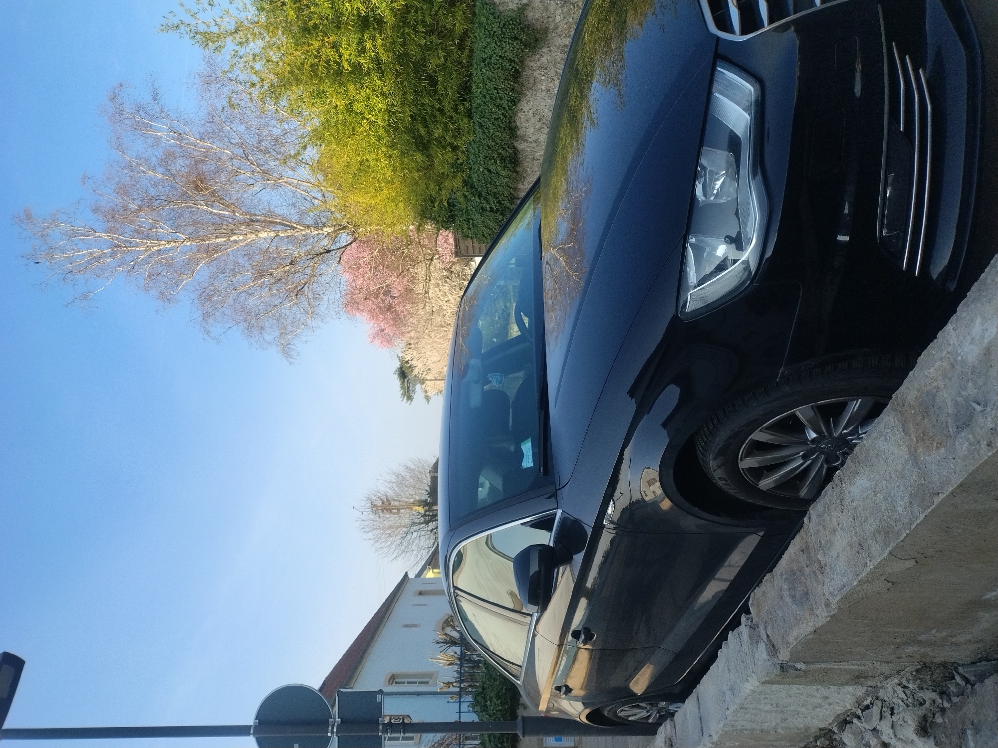 The image depicts a static outdoor scene in Crauthem, Luxembourg, under a clear blue sky. A black Audi sedan is parked on the right side of a paved area, positioned adjacent to a low, pre-cast concrete barrier. The vehicle's front right quarter, including its headlight assembly, front grille with chrome accents, and a portion of the hood, is prominently visible. Environmental reflections, primarily of trees and the sky, are present on the car's reflective surfaces. A white sticker is affixed to the interior of the windshield. On the left side of the frame, a dark gray street light pole, topped with a rectangular luminaire and featuring an attached circular dark gray sign, extends vertically. Behind the pole and the left side of the vehicle, a light-colored building with a reddish-brown tiled roof is discernible. In the background to the right of the Audi, varied vegetation includes a tall, bare deciduous tree with light-colored bark, a dense hedge of vibrant green bamboo-like plants, and trees displaying pink and white blossoms. A stone wall, partially covered by green groundcover, supports the vegetation line. The immediate foreground reveals fragmented concrete debris and earth adjacent to the concrete barrier. No individuals or active movements are observed within the frame.