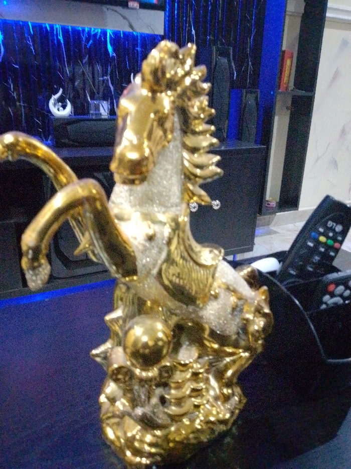 The scene depicts a domestic interior in Bar Gada, Nigeria. In the foreground, a gold and glitter-white equine statue, depicting a horse rearing on its hind legs, stands on a dark, polished surface. The statue features a sphere and coin-like motifs at its base. To the immediate right, a black caddy contains multiple remote controls, one bearing an "LG" logo. The background features a wall section with a dark, textured surface, illuminated by vertical blue LED light strips. Below this illuminated section, a dark console displays a white, abstract decorative object. To the right, a dark, tall cabinet or shelving unit holds additional dark decorative items and a red-orange rectangular object on an upper shelf. The floor appears to be a light, possibly tiled, surface. No individuals are present.