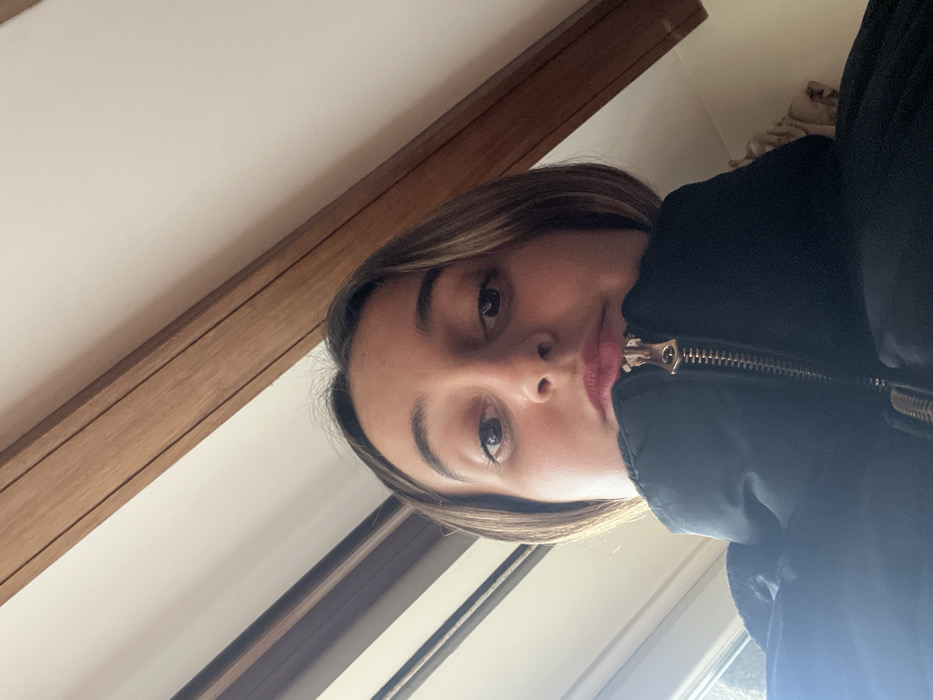 A young individual, appearing female, with medium-length brown hair, is captured in a close-up, low-angle indoor shot, looking directly at the camera with a neutral expression. The subject is wearing a black puffer jacket, zipped up to the chin, revealing a silver-colored zipper. The background features a light-colored ceiling or wall with two diagonal wooden beams of a medium brown tone. To the left, a dark-framed structure, possibly a window frame, is partially visible. This scene is located indoors in the city of Porto, Portugal.
