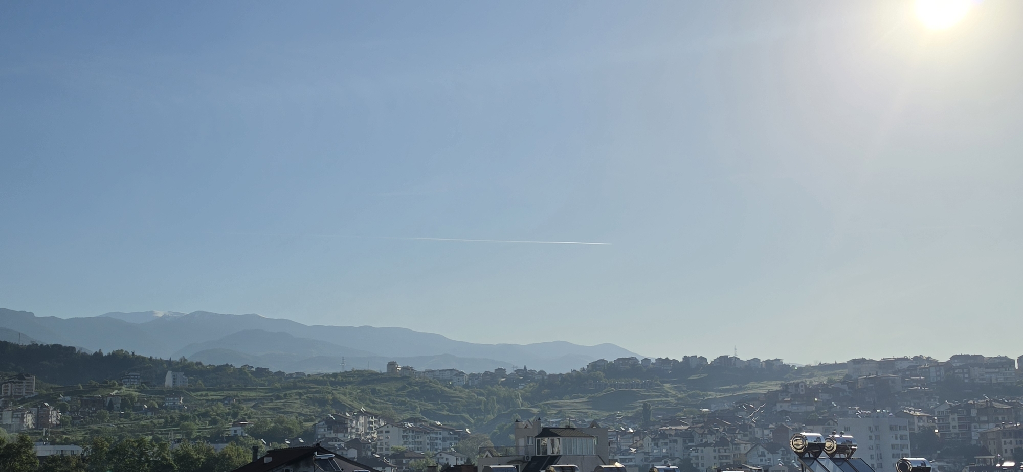 sunny, daytime view of Sandanski, Bulgaria. In the foreground is a densely populated area with various buildings, many with red tile roofs and solar water heaters on top. Further back, the cityscape blends into green hills, transitioning into a mountain range on the horizon. Patches of snow are visible on the distant peaks. A contrail stretches across the clear blue sky.