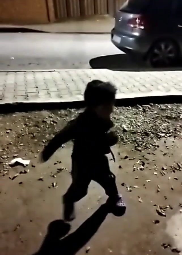 A young child wearing dark clothing stands on a dirty sidewalk at night, casting a long shadow. A parked car is visible in the background. The child is looking around, and the camera moves toward the ground. The ground is covered in debris.