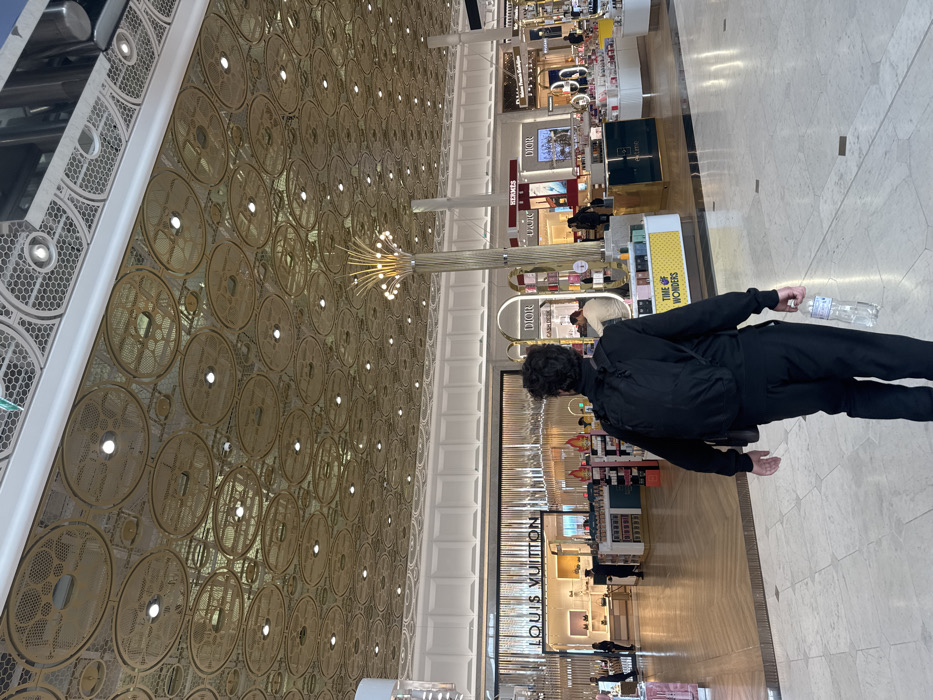 An indoor commercial area in Mauregard, France, is depicted. The scene shows a male individual, viewed from behind, walking away from the camera. He has dark, curly hair and is wearing a black long-sleeved top, black pants, and a black backpack. He holds a clear plastic water bottle in his right hand, and a dark pouch hangs from his left shoulder. The environment features a high ceiling composed of numerous circular, perforated gold-colored panels, each containing recessed spotlights. The floor is light-colored tile with dark linear accents. To the left, a "LOUIS VUITTON" boutique is visible, featuring a wide entrance, interior lighting, and display items. Several individuals are present inside and near the Louis Vuitton store. In the mid-ground and to the right, various luxury retail kiosks and storefronts are present, including "DIOR," "HERMÈS," and "BVLGARI" signage. These areas display cosmetics, perfumes, and other luxury goods. A large, decorative column resembling a tree with radiating lights is a prominent feature in the center-right. Multiple other individuals are visible throughout the background, engaged in activities such as browsing or walking. The area is uniformly illuminated by artificial light sources.
