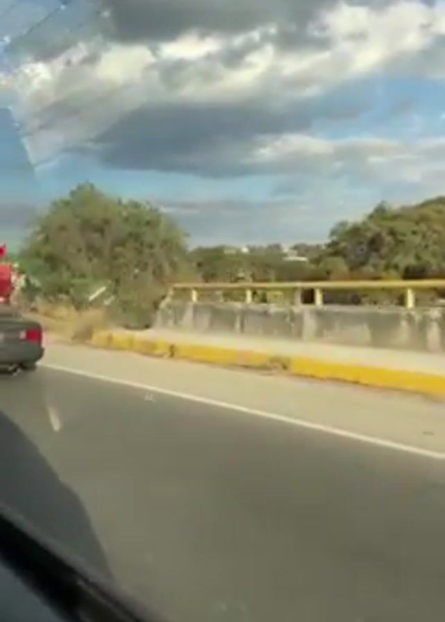 car ride, passing over a small bridge with yellow edges and guardrails. As the car continues, a gray car with red decorations on its roof passes by. The view then shifts to the car's interior. The environment consists of a road with grassy areas and trees on either side, under a partially cloudy sky.