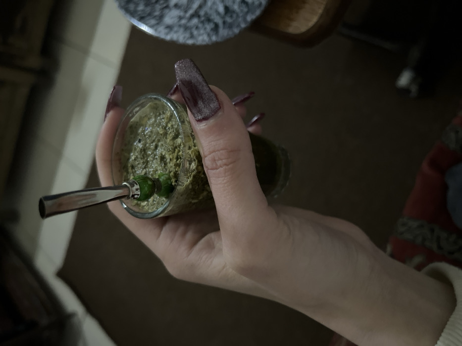 A hand holds a glass filled with green mate tea. A metal straw (bombilla) with green beads is inserted into the tea. The hand is light-skinned with long, glittery maroon fingernails. The background includes a dark floor, a patterned rug, and a piece of furniture. A chair with wheels is partially visible. The scene is dimly lit.