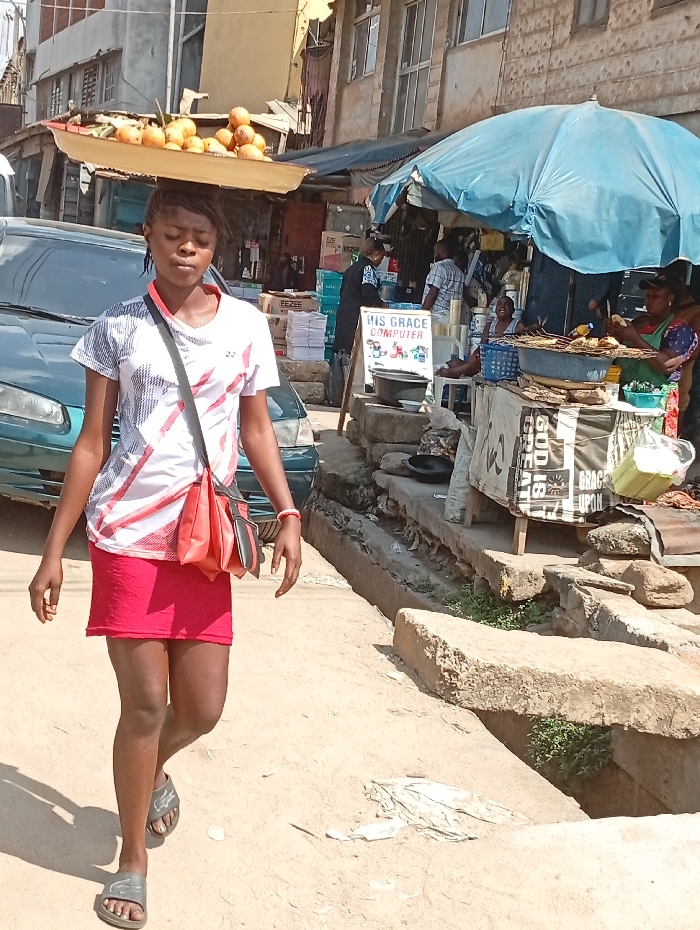 A young woman walks down a street, carrying a tray of oranges on her head. She wears a patterned shirt, a red skirt, and a red purse over her shoulder. Behind her, a car is parked and street vendors are selling goods under a blue tarp. A sign for “His Grace Computer” is visible. The street appears to be in a lower-income area, with worn buildings and concrete structures.
