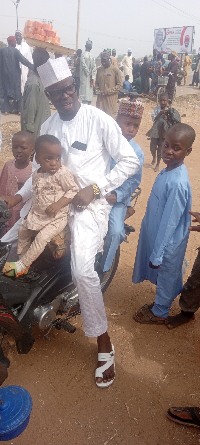 In Kofar Ruwa, Nigeria, an outdoor scene depicts a crowded urban environment. A man, wearing a white patterned kaftan, a white rectangular cap, black-rimmed glasses, a gold watch, and white toe-loop sandals, is seated on a black and silver motorcycle in the foreground. He holds a young child, dressed in a light brown patterned outfit and sandals, positioned in front of him on the motorcycle. Another boy, in a light blue kaftan and a patterned cap, sits directly behind the toddler, between the man's legs on the motorcycle. To the man's immediate right, a boy in a light blue kaftan stands and looks towards the camera. To his left, a child in a pink top is partially visible, holding a white stick-like object. The background reveals numerous individuals, primarily adult males in traditional attire, standing and walking in a busy street or market area. One person carries a stack of orange rectangular items on their head. A bicycle with a front basket is visible to the right. A large billboard in the far right background features two male political figures and text, including "SIYASA," "DABDAB ZAMAN," and English phrases such as "Trust in his immense leadership is just a part of blueprint that calls for betterment of the citizens." The ground is unpaved, consisting of packed dirt. The scene is illuminated by daylight.