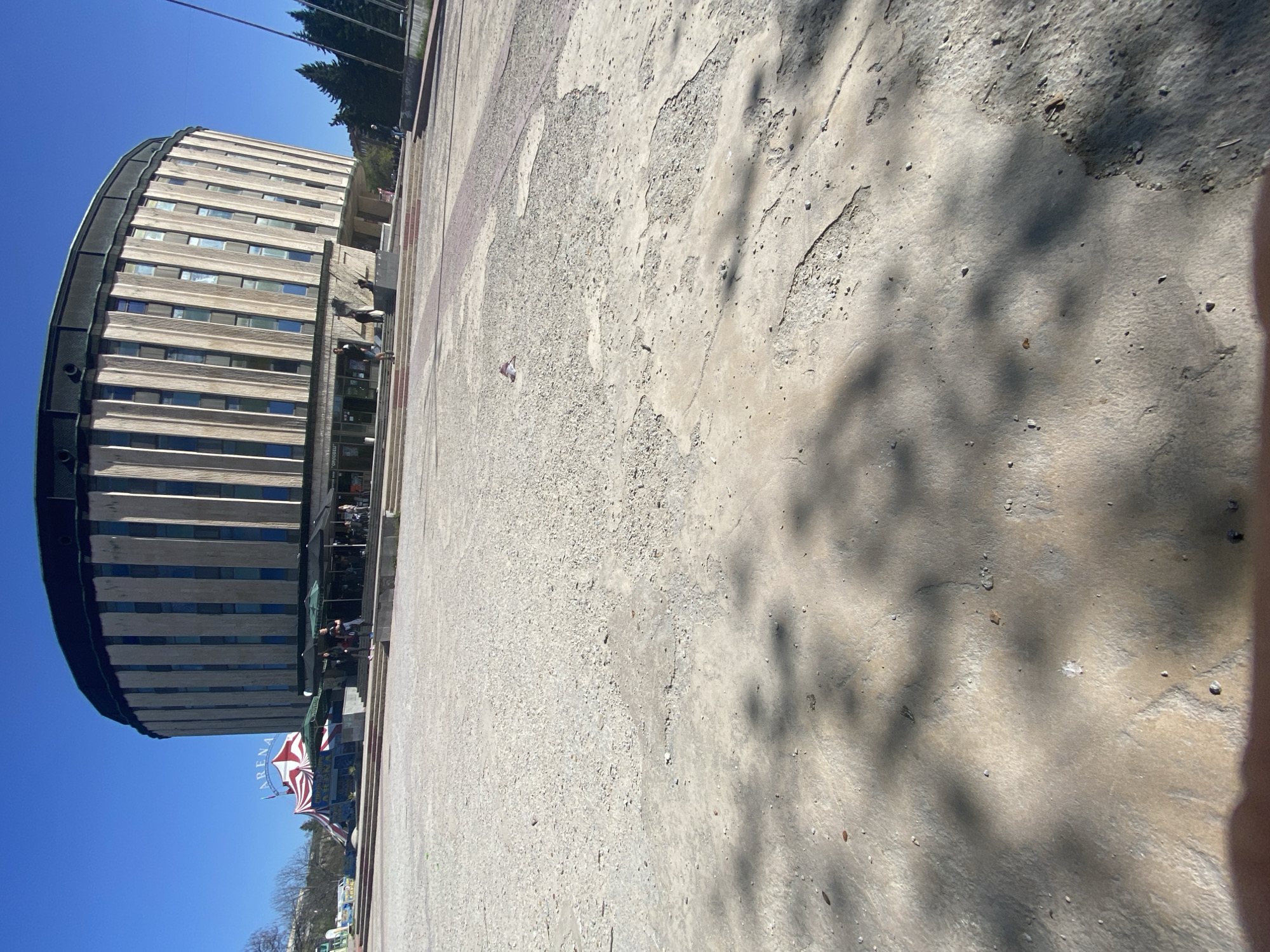 Arena Gabrovo building in Gabrovo, Bulgaria. The multi-story building is to the left of the image, with a curved facade. The building has numerous windows and horizontal stripes along its facade. To the right of the building is a large, paved area. The ground is textured and shows signs of wear. Tree shadows are cast on the pavement. People are seen near the entrance of the building. Flags, including the Bulgarian flag, are visible. The sky is clear and blue.