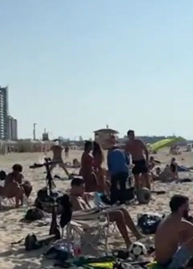 sandy beach on a sunny day, filled with people. Many are sunbathing, either sitting or lying down, while others are walking or standing. In the foreground, a woman in a red bikini stands next to a man in a blue shirt and straw hat, who appears to be selling something from a cart he's pushing. Another shirtless man stands nearby. In the background, tall buildings and construction cranes are visible on the horizon, indicating an urban environment. A lifeguard stand can also be seen behind the group.