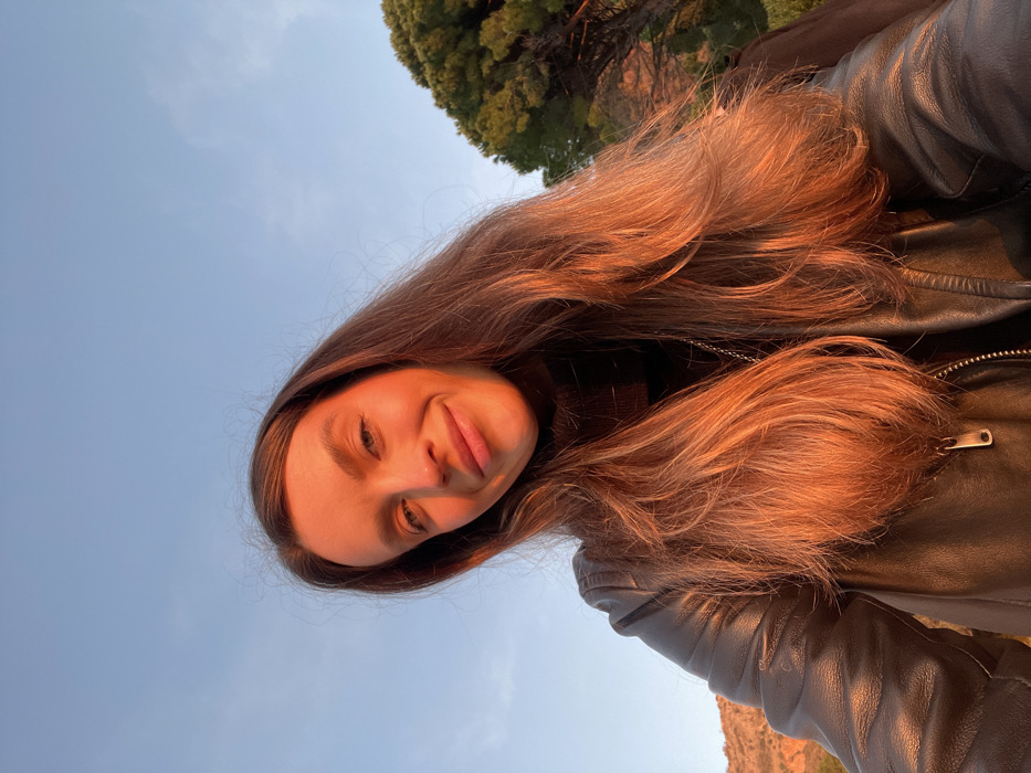 An outdoor, low-angle selfie depicts a young adult female in Sveti Stefan, Montenegro, illuminated by golden-hour light against a clear blue sky. The subject has fair skin and long, brown hair with reddish-orange highlights from the sun. She wears a dark leather jacket over a dark turtleneck and displays a subtle smile, looking directly at the camera. A thin, metallic chain necklace is visible. To the upper right, a portion of a dark green coniferous tree is present. To the left, a reddish-brown, arid hillside is partially visible in the distance. The lighting suggests either sunrise or sunset.