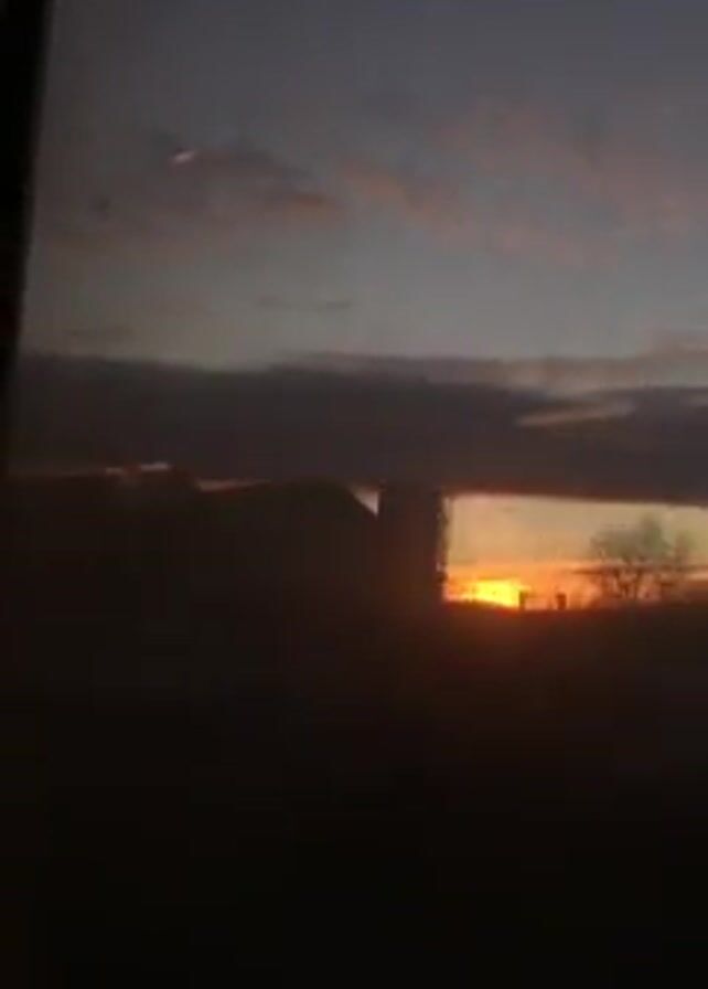 sunrise through a window. The sky is a mix of dark blue and pink hues, with clouds obscuring most of the sun. The foreground is dark, with silhouettes of buildings and trees.
