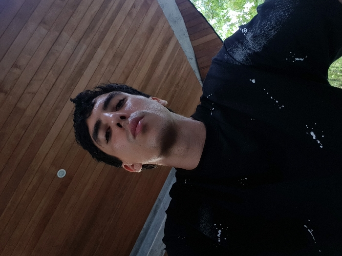 The scene, located in Patong, Thailand, features a male subject captured in an upward-angled, close-up shot. The individual has dark, wavy hair, dark eyebrows, and an olive-toned complexion, with his lips slightly pursed. He is dressed in a black long-sleeved shirt marked with random white paint splatters or bleach effects. Overhead, a wooden slatted ceiling is visible, incorporating one recessed circular light fixture. Green foliage is present in the upper and lower right sections of the background, adjacent to a visible concrete or stone structural support. The subject maintains direct eye contact with the camera.