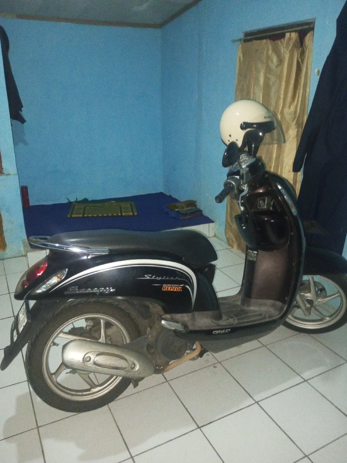 The image displays an indoor room, reportedly located in Karwan, India. A dark-colored Honda Scoopy motor scooter is parked, angled slightly right, on a white tiled floor. A white open-face helmet rests on the scooter's handlebars. The scooter is black with a black seat, a silver rear grab handle, and "Stylish" and "REPSOL" branding on its side fairing. The room features light blue painted walls. In the background, a dark blue mat covers a section of the floor, with a smaller rectangular patterned mat placed centrally on it. To the right of the patterned mat, a stack of folded fabric items is visible on the dark blue mat. A doorway in the rear right is covered by a light brown/gold curtain. A dark garment is suspended from a fixture near the doorway. A red cylindrical object is present on a low ledge or step on the left side of the frame. No individuals are present in the scene.
