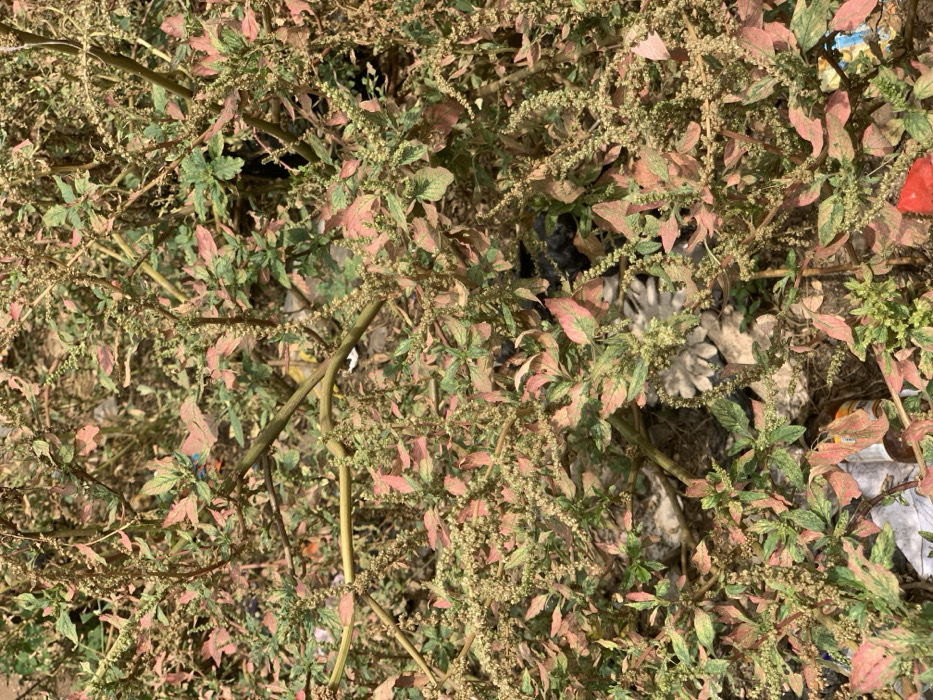 An overhead shot displays a dense patch of mixed green and reddish-pink variegated herbaceous plants, consistent with an Amaranthus species, featuring numerous small leaves and developing seed heads