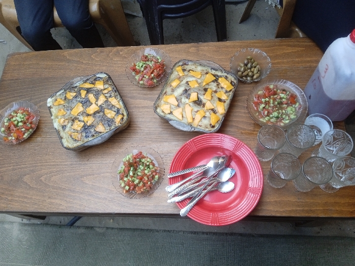 - "A wooden table in Al-Mawasi, Unknown, is set with various food items and tableware" by FM-cV3b62, licensed under CC BY 4.0