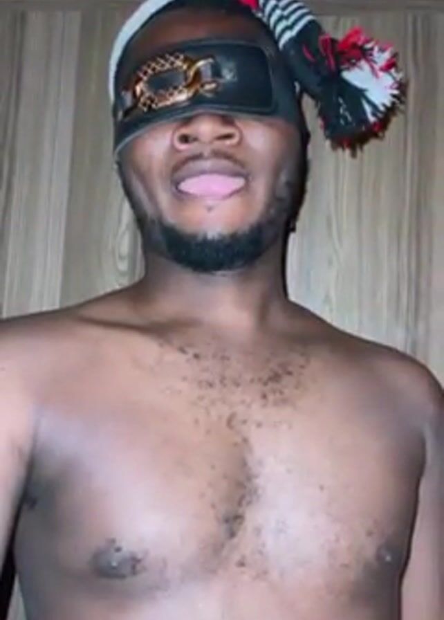 A shirtless man with a short beard and dark skin stands facing the camera. He is wearing a black eye mask adorned with a gold chain design and a white and black knit hat with a red and black pom-pom. He purses his lips and sticks his tongue out briefly. He is standing in front of a light-colored wooden paneled wall.