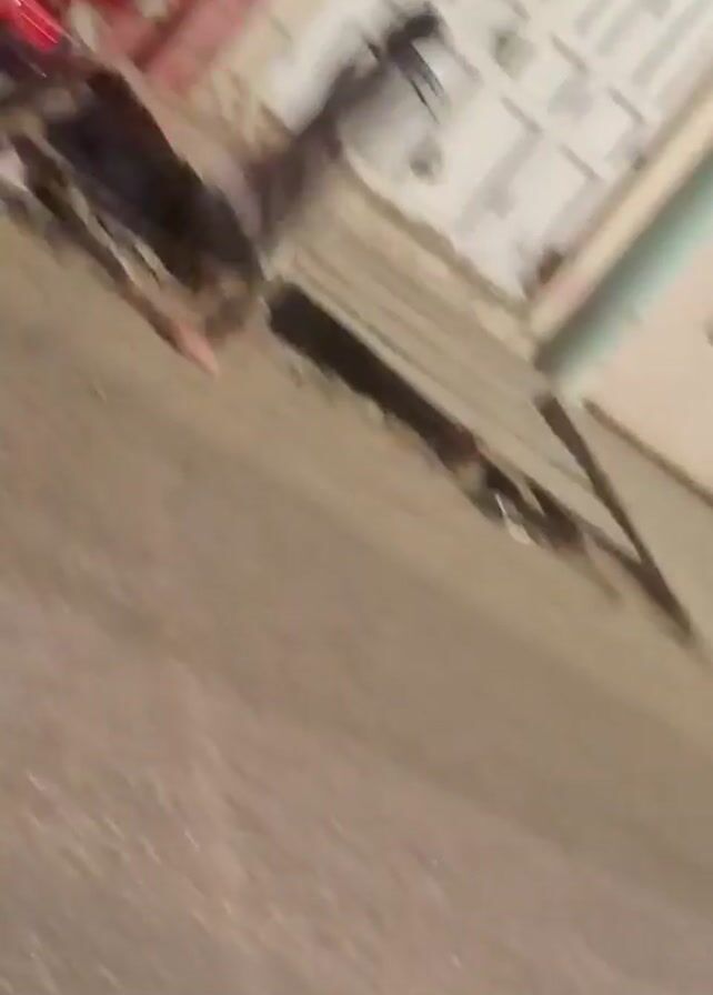 first-person perspective from what appears to be a moving vehicle at night. Initially, the video is very shaky and blurred, capturing glimpses of a car's headlight and wheel. The camera then seems to stabilize, offering a clearer view of the road and surroundings. The focus shifts to the handlebars of the vehicle the camera is mounted on. Various vehicles, including what appears to be a three-wheeled auto rickshaw and some construction vehicles, are visible in the background. The lighting is dim, and streetlights illuminate the road.