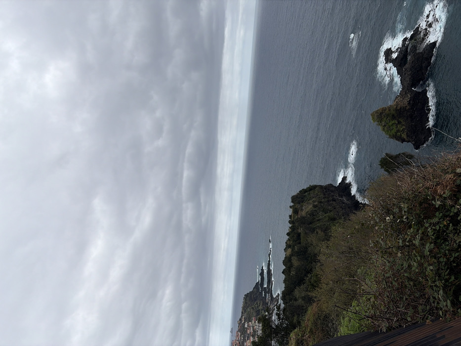 This image depicts a wide-angle coastal landscape in Porto Moniz, Portugal, under an overcast sky. The upper third of the frame is dominated by a uniform expanse of light grey, dense clouds. Below this, the horizon forms a clear, straight line where the dark blue-grey, choppy Atlantic Ocean meets the sky. On the left side, a rugged coastline extends from the foreground into the distance. The immediate foreground features dense, untamed vegetation consisting of dark green shrubs and bushes, with some brown, possibly dry, foliage visible. A dark, diagonal structure, likely a railing or part of an overlook, borders the extreme bottom left. Further along the coastline to the left, dark, steep cliffs are covered with a mix of evergreen trees and lush green vegetation. In the far distance on the left, a cluster of buildings with light-colored walls and terracotta roofs indicates the presence of the town of Porto Moniz, nestled along the shoreline. The ocean surface exhibits numerous ripples and small whitecaps. Towards the bottom right of the image, several prominent dark, volcanic rock formations emerge from the sea. One larger formation, roughly conical, is topped with green vegetation, while others are bare and angular. Waves are actively crashing against these rocks and the coastline, generating white foam. No people, discernible actions, or interactions are present within the frame.