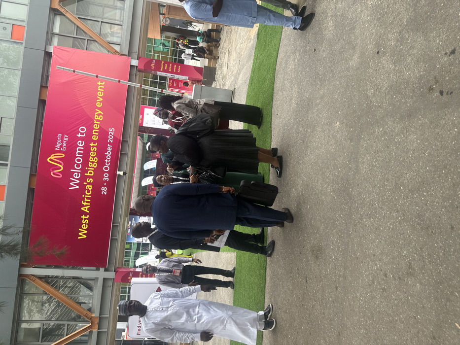 The image depicts an outdoor gathering of individuals at the entrance or immediate vicinity of an event venue in Alaguntan, Nigeria. A large red banner, prominently displayed, reads "Nigeria Energy, Welcome to West Africa's biggest energy event, 28 - 30 October 2025." The ground in the foreground is concrete, transitioning to artificial green turf further back. Multiple adults are present, primarily in business or traditional Nigerian attire. In the left foreground, a man in a white traditional Nigerian outfit with a cap stands facing slightly right. In the mid-ground, a central group of approximately five to seven individuals are engaged in conversation; one man in a dark suit faces away from the camera, holding a black briefcase, while a woman in a dark pleated dress and carrying a shoulder bag faces towards him. Other individuals in this group wear lanyards, indicating event participation. To the far right, several people are visible, some partially cropped, and others are seated on a low structure in the background. A white barrier pole is visible to the right of the red banner. The background features a modern building facade with glass and grey panels. The scene suggests a professional conference or exhibition environment.