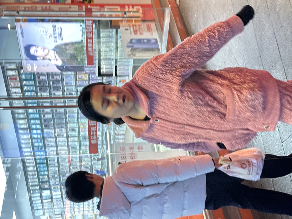 The image depicts a street scene in an unspecified city in China, featuring two individuals walking on a paved sidewalk in front of a glass storefront. In the foreground, a female with dark hair, wearing a textured, pink, fluffy hooded jacket over a black top and matching pants, walks towards the left side of the frame. Her mouth is slightly open, and her eyes appear partially closed. Her left hand is covered by a black glove or sleeve. Behind her, to the left, another person, viewed from the back, wears a light pink or off-white puffy hooded jacket and dark pants. This individual holds a small white plastic bag with red lettering in their left hand and also walks towards the left. The background consists of a glass storefront displaying numerous mobile phone cases arranged in shelves. Visible signs inside the store feature Chinese characters, including "精品手机折" (Quality Phone Discount), "以旧换新" (trade-in for new), an advertisement poster with a male model, and a sign displaying a phone image with "¥999" partially visible. The scene is illuminated by artificial light.