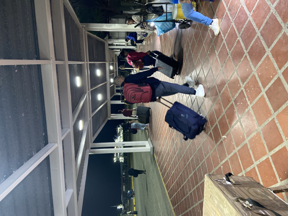 People pull luggage along a covered walkway with a red brick tile floor. A man in a navy jacket and red backpack is centered. Some people have carts with belongings. A row of bright lights illuminates the walkway, which connects to a darker outdoor area where ships are docked. It is nighttime.