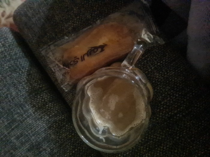 An overhead shot depicts a clear glass mug filled with a light brown, foamy beverage, possibly coffee or tea. Alongside it rests a packaged pastry, presumably a snack or breakfast item. The items are positioned on a textured grey surface, likely fabric, suggesting a relaxed, informal setting. The scene conveys a simple moment of relaxation.