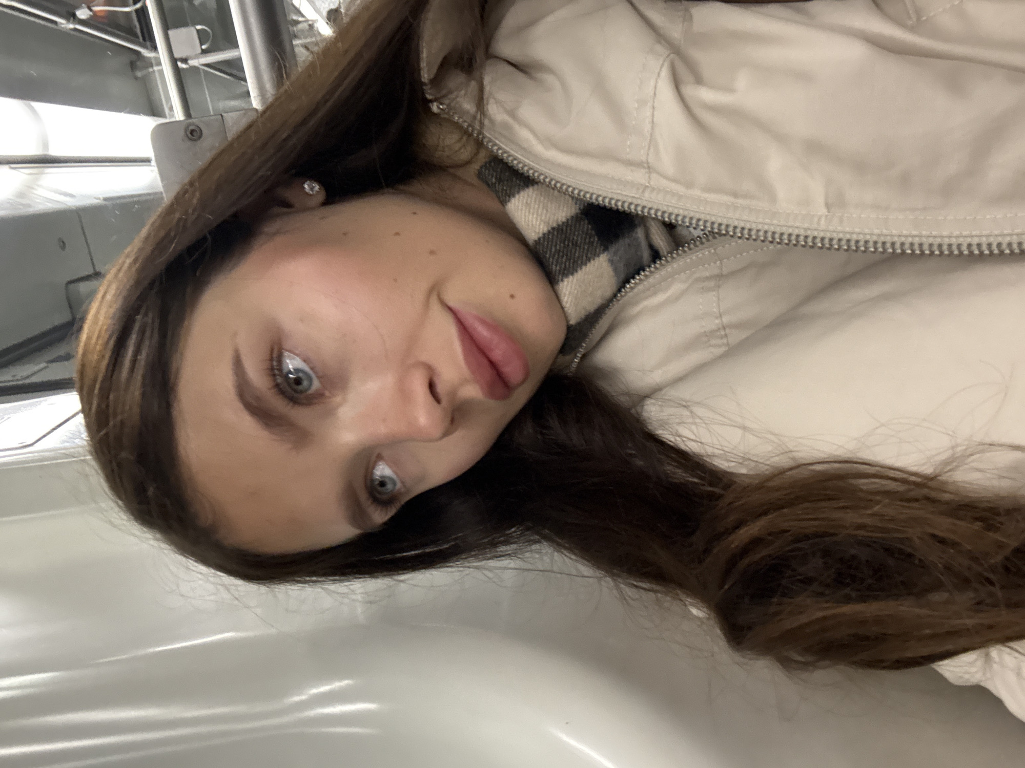 A close-up image portrays a female individual from the chest up, positioned within an indoor environment. She possesses long, dark brown hair, blue eyes, and light skin with several small moles on her right cheek. A small, circular, silver-colored stud earring is present in her right earlobe. Her lips are slightly parted, exhibiting a pinkish hue. She wears a light beige or off-white zip-up jacket, partially revealing a plaid scarf underneath with a pattern of black, white, and tan stripes. Her gaze is directed towards the upper left, away from the camera. The background on the left consists of a light-colored, possibly white, paneled or curved surface with vertical light reflections. To the upper right, metallic fixtures, potentially handrails or overhead structures, are visible alongside indistinct overhead lighting. The specific location within the Municipal Unit of Elliniko, Greece, cannot be ascertained from the visual evidence in the image.