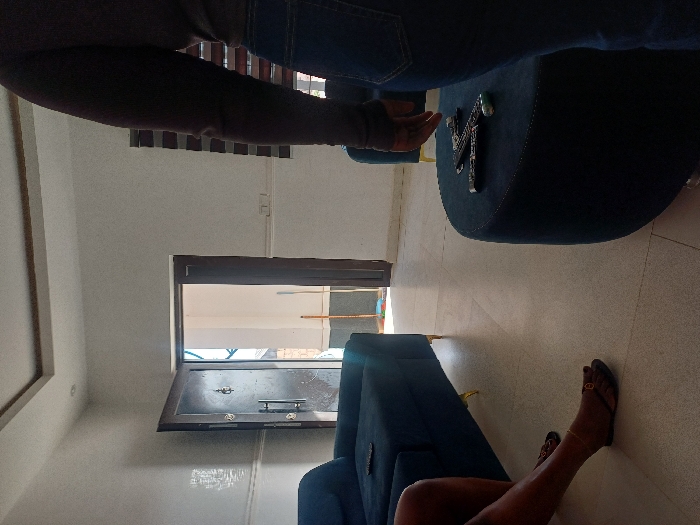 This image displays an interior living space, situated in Katon Rikkos, Nigeria. The room features light-colored walls and a light-toned tiled floor. The ceiling is white with a recessed rectangular panel. Natural light illuminates the scene, entering primarily through a centrally located open dark metal security door, which reveals an outdoor area where a dark wooden pole is visible leaning against a wall. Furniture present includes a dark blue three-seater sofa with gold-colored tapered legs positioned on the left, holding a black remote control on its seat. To the right, a round dark blue ottoman or pouf supports two black remote controls and a small green cylindrical object. The armrest of another matching dark blue armchair is partially visible in the background on the right, behind which a dark horizontal window blind or shutter is mounted on the wall. Two individuals are partially depicted. On the left, the lower legs and feet of a person are visible, wearing black flip-flops and a gold-colored anklet, positioned as if seated on the sofa. On the right, a second individual is observed from the waist down and back, wearing a dark long-sleeved top and blue jeans. Their right hand is visible, positioned near the ottoman.
