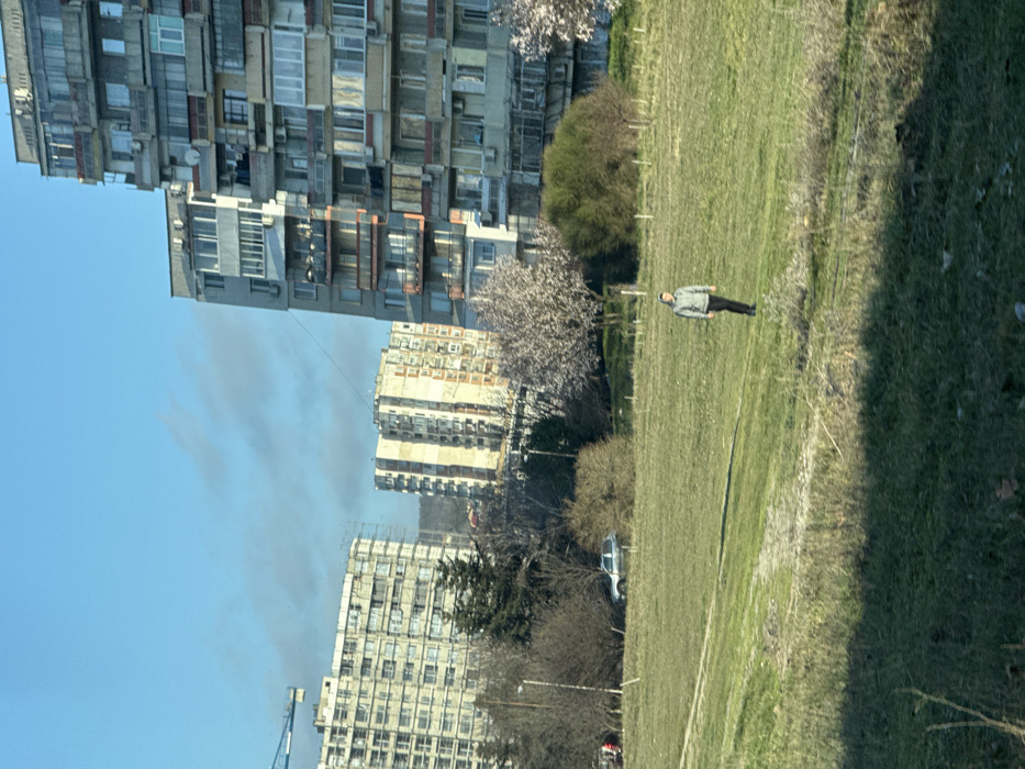 This image presents an urban landscape in Varna, Bulgaria, under a clear blue sky with faint cirrus clouds. The foreground consists of an expansive, unkempt grassy field with varying shades of green, indicating new growth, and pronounced shadows cast diagonally from the left. A single individual, appearing male, stands approximately in the center-right of the mid-ground within this field. He is dressed in a light-colored hooded jacket and dark trousers, facing slightly left of the viewer. He appears to be static. Behind the field, a line of deciduous trees and shrubs, some still bare and others exhibiting early spring blossoms, create a visual barrier. Partially obscured by this foliage, a silver-colored sedan is visible on what appears to be an unpaved area or road segment. The background is dominated by several multi-story residential buildings. On the far right, a tall, grey apartment block features numerous balconies, many enclosed with windows, and multiple external air conditioning units. To its left, another light-colored (beige) apartment building is visible. Further to the left, a large, light-colored residential structure appears to be under construction or undergoing renovation, with scaffolding present on its side. A blue construction crane is partially visible behind this building on the left. Distant hills with sparse vegetation form the horizon.