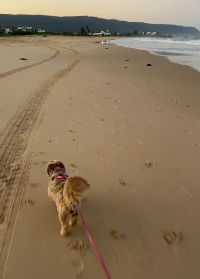 The video begins with a view from behind a small dog with tan fur walking on a sandy beach, on a pink leash held by an unseen person