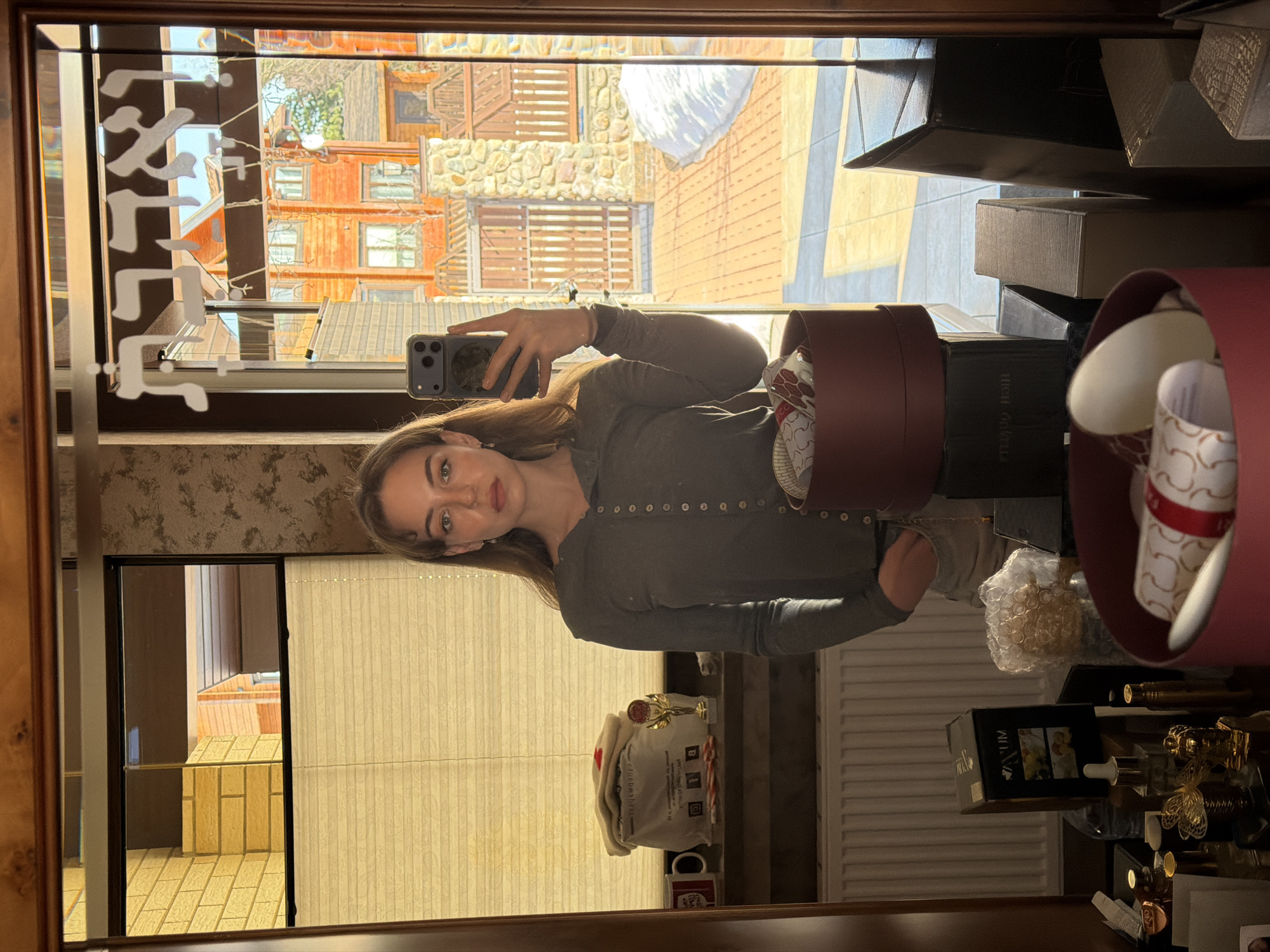 A woman is taking a selfie in a mirror. The reflection shows a view of buildings and a fence, possibly in Mishutkino, Russia. The woman is holding a smartphone. Reflected on the shelf is a variety of objects: boxes, wrapped items, and perfume bottles. The room behind the shelf contains a window with a partially drawn blind and a radiator. The mirror has a decorative border.