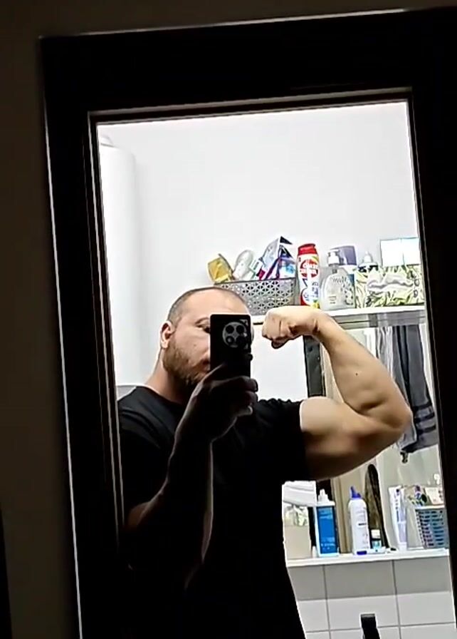 A bald, bearded man in a black T-shirt is taking a selfie in a bathroom mirror. He is flexing his right bicep for the photo. The bathroom is mostly white with a white tiled lower wall. A shelf is visible behind him, holding various toiletries and other items including a red bottle of ketchup and a metal wire basket. A gray towel is hanging to the right of the shelf. The mirror has a dark brown frame. The man's phone is covering his face.