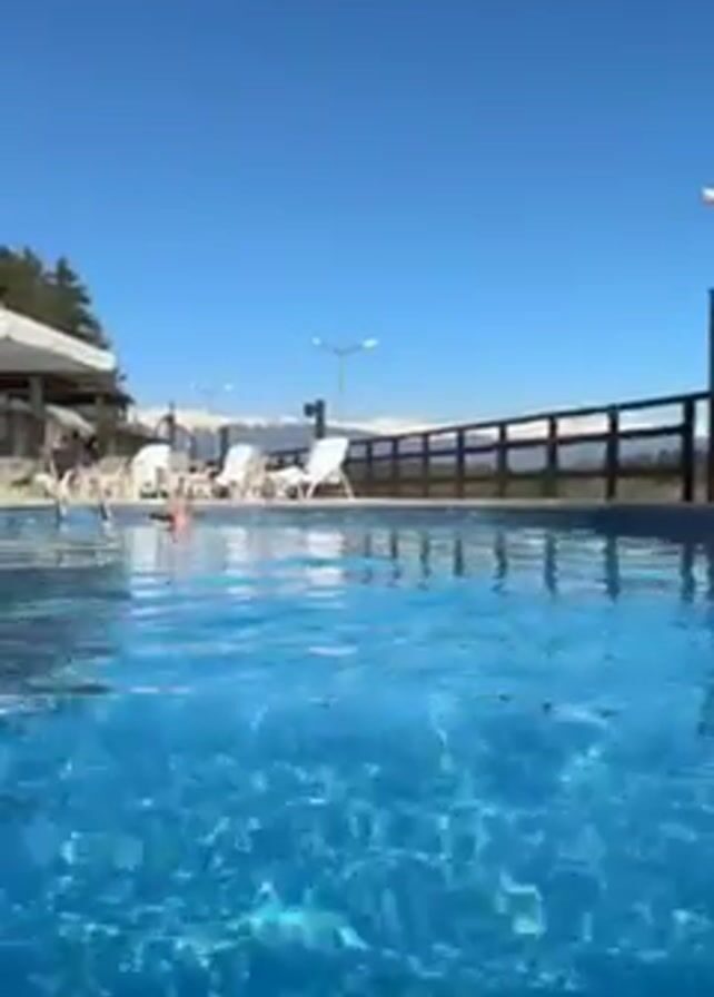 n outdoor swimming pool with clear blue water. In the background are snow-covered mountains under a clear, bright blue sky. Along the edge of the pool are white lounge chairs and a wooden fence. There are also a few lamp posts. A man is swimming in the pool. The camera is positioned in the water, providing an eye-level view of the pool's surface.