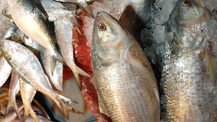- "This vertical close-up image captures a display of fresh fish, primarily Hilsa (Tenualosa ilisha) or a similar species, arranged on ice within a market setting in Narayanganj, Bangladesh" by FM-PRZ6s1, licensed under CC BY 4.0