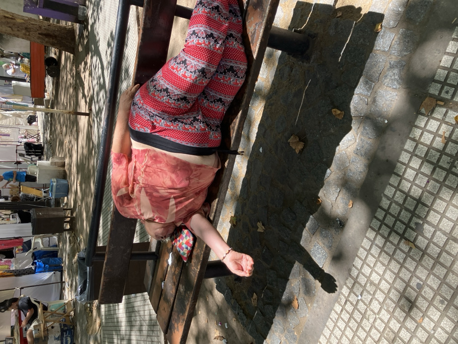 An older woman lies diagonally across a park bench, wearing red patterned pants and a pink top. Her head rests on a colorful object. Sunlight filters through leaves, casting shadows on the cobblestone ground. In the background, stalls and tents line a street.
