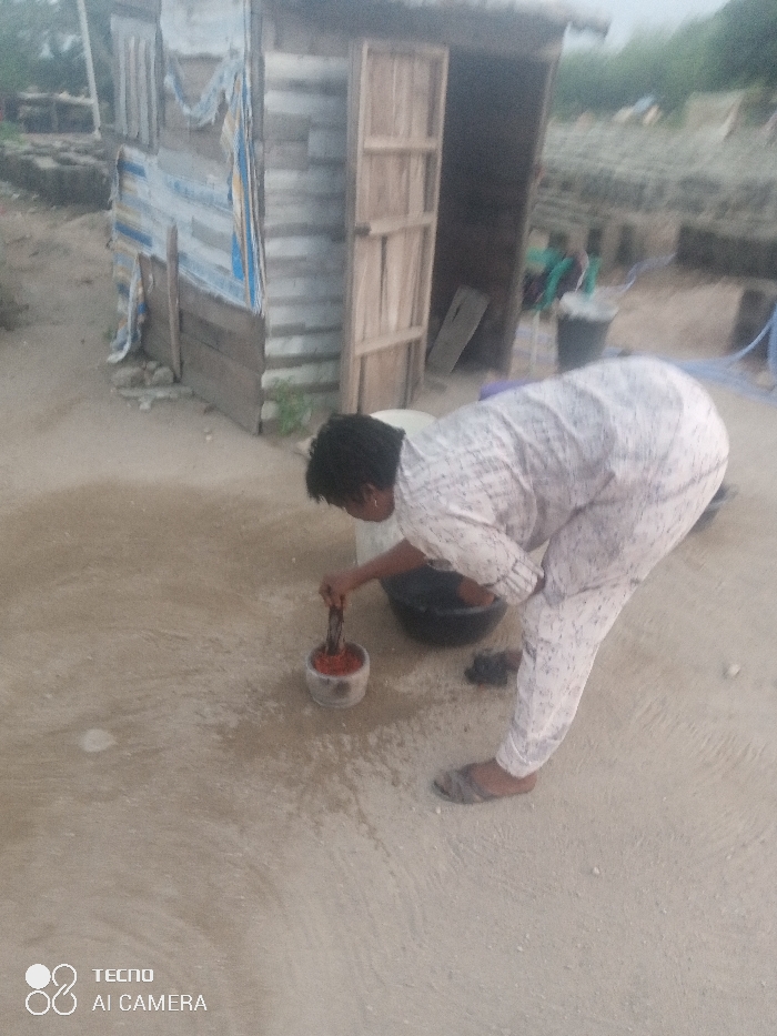 A woman in patterned pajamas and slippers is grinding a reddish substance in a stone mortar with a pestle. She is bent over, working outside. Behind her is a weathered wooden shack with an open door. A black basin sits beside the mortar. In the background, stacks of bricks are visible along with a blue water hose and other containers. The ground appears to be wet.